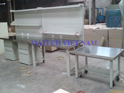Bàn thao tác khung thép mặt đá và khung thép mặt gỗ Matech gia công theo yêu cầu
