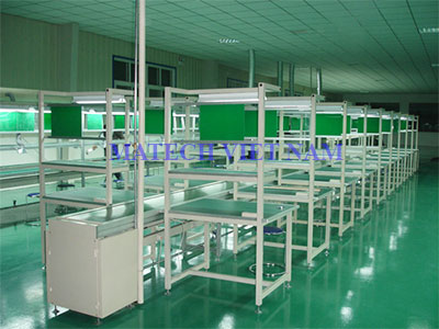 Mặt bàn thao tác khung thép trong ảnh dùng mặt gỗ công nghiệp MDF dày 18mm có dán thảm cao su chống tĩnh điện màu xanh lá dày 2mm. Bàn thao tác được đặt hai bên băng tải PVC, giúp cho công nhân vừa gia công sản phẩm, vừa đặt luôn sản phẩm đã gia công xong lên băng tải để chuyển hàng đến cuối băng.