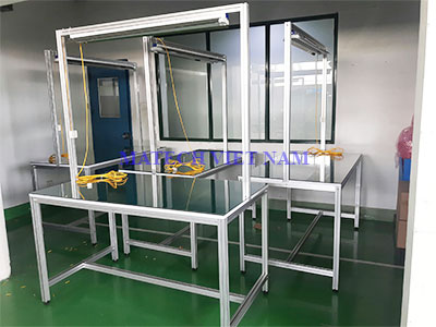 Bàn thao tác nhôm định hình có dàn đèn giữa là loại Bàn thao tác công nghiệp có cấu tạo đơn giản