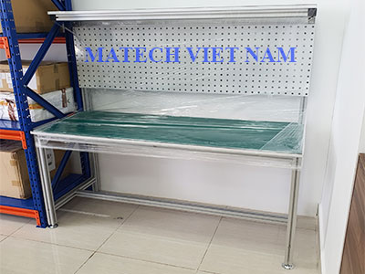 Bàn thao tác khung nhôm có giá treo đồ Matech Viet Nam sản xuất là một sản phẩm được gia công theo yêu cầu của khách hàng, mang lại sự tiện ích và hiệu quả trong việc sắp xếp và treo đồ trên bàn làm việc.