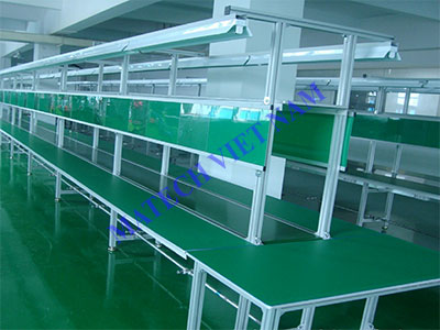Bàn thao tác nhôm định hình gắn với băng chuyền có nhiều loại kích thước khác nhau, phù hợp với từng địa hình cần đặt của các công ty, chiều dài tối thiểu từ 10 mét trở lên.