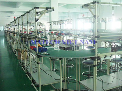 Bàn thao tác ống thép bọc nhựa trong ảnh được lắp đặt cho nhà máy Samsung, chuyên dùng để lắp ráp, kiểm tra linh kiện điện thoại. Vì là những linh kiện nhỏ, khối lượng nhẹ, nên sử dụng bàn ống thép bọc nhựa liên kết khớp nối HJ sẽ có chi phí hợp lý nhất.