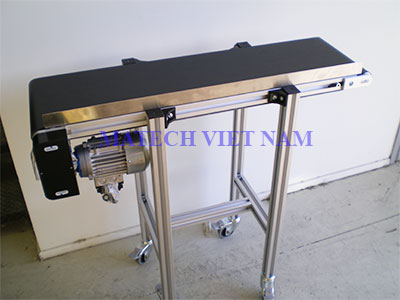 Hình ảnh Băng tải khung nhôm như trên được Matech Lắp thêm 4 bánh xe giúp thuận tiện trong việc di chuyển Băng tải từ vị trí này đến vị trí khác mà không mất nhiều thời gian.