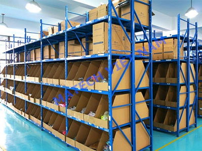 Kệ trung tải trong hình gồm 5 tầng để hàng. Hai tầng trên cùng không chia vách ngăn, ba tầng dưới có chia từng ngăn giúp doanh nghiệp phân biệt sản phẩm trong mỗi ngăn để hàng.