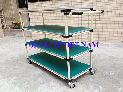 Xe đẩy hàng 4 tầng ống thép bọc nhựa lắp khớp nối HJ trong hình được Matech sử dụng khớp nối HJ2, khớp nối HJ13 và kẹp bánh xe để lắp ghép, cố định mặt gỗ với ống bọc nhựa bằng đai ôm 1 cạnh. Với 4 tầng để hàng, có thể để được rất nhiều chi tiết trong cùng 1 lần vận chuyển.