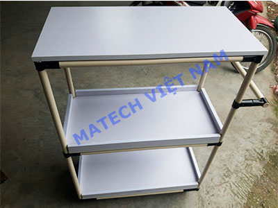 Xe đẩy hàng 3 tầng trong ảnh được gia công theo dạng lắp ghép, không dùng đến mối hàn. Các chi tiết được lắp ghép lại với nhau bằng khớp nối HJ có bulong, ecu đi kèm khớp. Dạng xe đẩy lắp ghép này chỉ vận chuyển những sản phẩm có khối lượng nhẹ, dưới 50kg, sản phẩm nặng hơn quý khách hàng nên chuyển sang xe đẩy hàng khung thép, xe đẩy hàng khung inox hàn cố định chắc chắn. Matech gia công theo yêu cầu các loại xe đẩy hàng, bàn thao tác, băng tải PVC, băng tải con lăn, giá kệ để hàng,.... Quý khách hàng tham khảo thêm sản phẩm trên website của công ty chúng tôi.